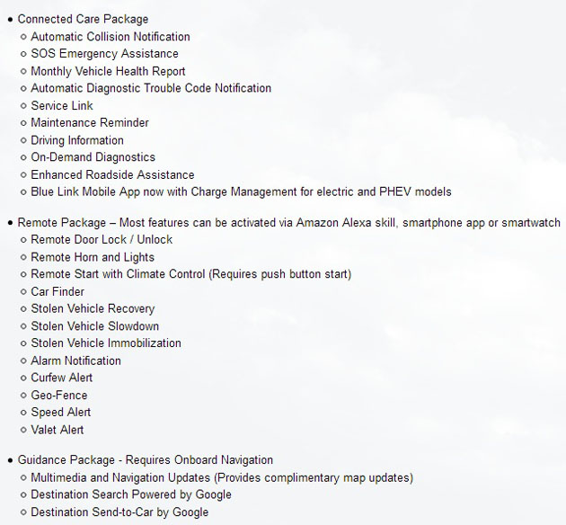 Akıllı telefon, smartwatch ve Amazon Alexa üzerinden 3 yıl kontrol edilebilen özellik, 2017 Ioniq modellerinin yanı sıra Blue Link donanımlı 2018 Santa Fe Sport, Elantra GT ve Sonata'da ek bir ücret ödemeden sunuluyor. Buna ek olarak, Hyundai ayrıca kullanıcıların arka cam ısıtıcısı ve ısıtmalı yan aynalara da uzaktan erişim imkanı veren iklim kontrolü özelliği ile Blue Link Remote Start sistemini geliştirdi.