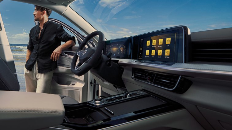 İçeride, aynı panelde 10.2 inçlik gösterge paneli ve 12 inçlik bilgi-eğlence dokunmatik ekranını barındıran VW'nin imzası niteliğindeki dijital kokpiti ile gösterge paneli tanıdık bir görünüme sahip. Panoramik sunroof ve açık renkli kumaş döşeme karizmaya katkıda bulunurken, gösterge panelinin minimalist tasarımı, altında açık bir saklama bölmesi bulunan yüksek bir orta tünel ile birleştiriliyor.