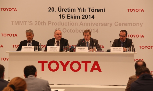 Toyota Otomotiv Sanayi Türkiye A.Ş. üretimde 20. yıla ulaşmasının coşkusunu bugün yapılan bir törende 3,500 çalışanıyla kutladı. Türkiye’nin ihracat liderleri arasında yer alan Toyota Otomotiv Sanayi, halen Corolla ve Verso modellerini üretiyor. 2014 yıl sonunda 135 bin adet otomobil üretmeyi ve bunun yüzde 85’i ihraç etmeyi planlayan Toyota Otomotiv Sanayi, yıl sonunda 2 Milyar Dolar’lık ihracat hedefine ulaşmayı planlıyor.