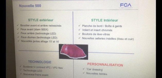 Şu anki Fiat 500'ün motor serisi yeni modele de taşınacak. 1.2 litre 8 valf 69 hpmotor ve 0.9 TwinAir (85 hp ve 105 hp güç çıkışı modlarıyla) de seriye dahil. Vites seçenekleri ise 5 kademe manuel ve 5 kademe Dualogic otomatik. İnternete sızan sunumda makyajlı yeni Fiat 500'de yeni ön disk frenleri yer alacağı görülüyor.