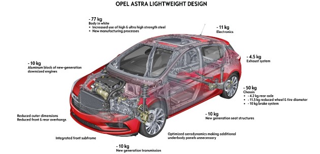 Opel 2016 Astra modelini nasıl 200 kg hafiflettiği ile ilgili üretim sürecine dair yeni detaylar yayınladı. Ağırlık kaybındaki en büyük etken otomobilin yeni mimarisi. Bu sayede kaporta ve gövde yapısı 77 kg daha hafif. Bir 50 kg da hafif süspansiyon bileşenleri kullanılarak ve aerodinamik kaplamaya gövde altının tamamında yer vermeme kararı ile kaybedilmiş. Model ayrıca öncekinden 4.5 kg daha hafif bir egzoz sistemine sahip. Astra'nın yeni tekerlek ve lastikleri de öncekinden 11.5 kg daha hafif. Mühendisler daha kompakt bir fren sistemi kullanarak 10 kg ağırlık azaltımına rağmen daha iyi performans sağlamışlar.