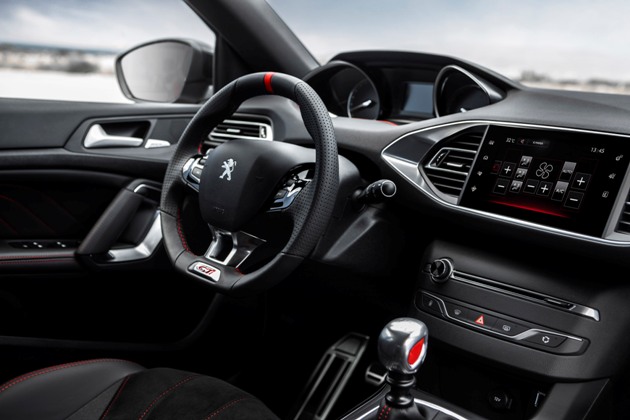 GTi 270 versiyonda, « Peugeot Sport » yazılı deri ve alkantara sportif koltuklar otomobil ile bütünleşmek ve her durumda yolunu hissetmek amacıyla mükemmel bir yan koruma sunuyor. 351 x 329 mm’lik kompakt sportif direksiyon doğal bir kavrama ile otomobile milimetre hassasiyetinde yön verilmesine izin veriyor. Tam deri direksiyon simidi tabanında GTi logosunu ve tepesinde kırmızı merkezleme işaretini barındırıyor. Sürücü ilk bakışta, özel damalı desene sahip gösterge paneli, ve ortadaki ekranı süsleyen « GTi » mesajı ile karşılaşıyor.