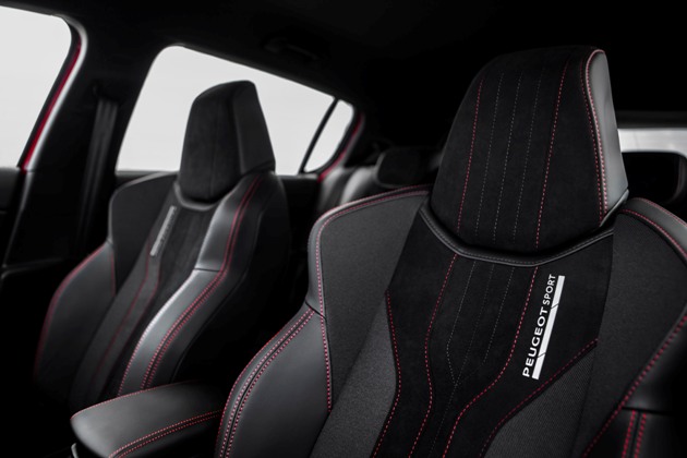 Otomobilin bütünüyle mükemmel uyum içinde olan iç mekanın tasarımı, tüm iç mekanı kaplayan koyu ambiyansıyla son derece sportif bir görüntü oluşturuyor. Kırmızı dikişler gösterge panelini, koltukları, kapı içlerini, vites kolu körüğünü ve üst seviye kalitede paspasları özgünleştiriyor. Öte yandan, « Peugeot Sport » ve « GTi » yazılı marşpiyel, pedal takımı, ayak dayama ve vites kolu topuzu alüminyum alaşımdan üretildi.