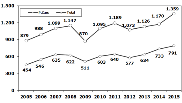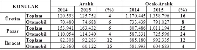 2015 yılında bir önceki yıla göre, toplam üretim yüzde 16, otomobil üretimi ise yüzde 8 oranında arttı. Bu dönemde, toplam üretim 1 milyon 359 bin adet, otomobil üretimi ise 791 bin adet düzeyinde gerçekleşti. 2015 yılında bir önceki yıla göre toplam pazar, yüzde 25 oranında artarak 1 milyon 11 bin adet düzeyinde gerçekleşti. Bu dönemde otomobil pazarı yüzde 24 arttı ve 726 bin adet olarak gerçekleşti. 2015 yılında bir önceki yıla göre, toplam otomotiv ihracatı adet bazında yüzde 12 oranında artarken otomobil ihracatı ise yüzde 4 oranında arttı. 2015 yılında toplam ihracat 992 bin adet, otomobil ihracatı ise 605 bin adet düzeyinde gerçekleşti.
