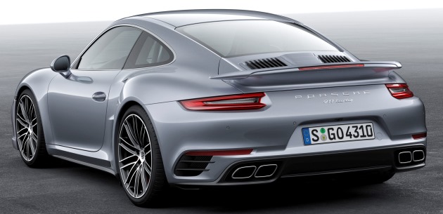 Doğal olarak yeni nesil 911 Turbo, 911 Turbo’nun tipik özel yönleriyle günümüzün Carrera modellerinin çarpıcı tasarımının belirgin özelliklerini bünyesinde toplamış. Yanlardaki hava kanatçıkları ve özellikle dar olarak şekillendirilen çift dolgulu ön LED farların ana hava girişindeki ek kanatla birleşimi, ön tarafa daha geniş bir görünüm katmış. Yandan bakıldığında, yüksek performanslı spor otomobilin 20 inçlik tekerlekleri göze çarpıyor. Örneğin 911 Turbo S’teki göbek kilidi, artık çift jant tellerinden 10 yerine yedi tane taşıyor. Ayrıca 911 Turbo için yeni jant boyutları: önde 9 J x 20, arkada 11,5 J x 20’dir. Yeni jantların her biri yarım inç daha geniş ve 911 Turbo S’in lastikleriyle aynı boyutlardalar. Yeni Carrera modellerinde olduğu gibi, kapı kolları yenilenmiş. Yeni modellerin arka bölümünde de yenilikler bulunuyor. Yine 911 Carrera modellerinden tanıdık gelen 3 boyutlu arka aydınlatmalar ilk bakışta dikkat çekiyor. Arkada yer alan egzoz sisteminin çıkışları kadar çift egzoz sistemi de yeniden tasarlanmış. Arka kapak ızgarası da yeniden tasarlanmış ve üç bölümden oluşturulmuş: Sol ve sağ kısımlarda dikey hava delikleri, ortada ise motora optimize hava girişi için ayrı bir kapak.