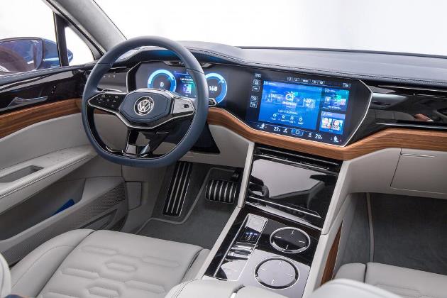 Touareg otomobillerin pek çoğu belki VW’nin dijital enstrüman paneli ile kombine edilem geleneksel merkezi multimedya ekranı ile gelirken, konseptin radikal dokunmatik sistemi de en azından opsiyonel olarak sunulacaktır. 15 inç genişliğindeki bu ekran sürücüye dönük ve üretim versiyonunda yansımayı ve parlamayı azaltmak için ekrana hafifçe kavis verilecek.
