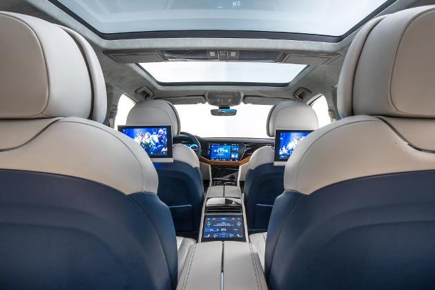 Kabinin arka kısmı ise iki koltuklu formatta. Konseptte arkaya dönük üç ekran bulunuyor, bunlardan ikisi ön koltukların sırt kısımlarında, dikey bir ekran da orta konsola yakın konumlandırılmış. Bu ekstra ekranların üretim versiyonunda bulunması beklenmiyor. Müşterilerin bunun yerine güçlü 4G internet bağlantısıyla kendi tablet ve akıllı telefonlarını kullanmayı tercih edecekleri düşünülüyor. Dört koltuklu oturma düzeni üretim versiyonunda standart olmayacağı için belki ekstra ekranlarla dört koltuklu bir versiyon daha sonra çıkabilir.