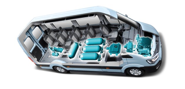 İki yıl önce tanıtılan hafif ticari taşıt temel alınarak geliştirilen yeni çalışma markanın gelecekteki hafif ticari araçlar serisine ışık tutuyor. Taşıtın elektrikli motor, yakıt hücresi yığını, yüksek voltajlı batarya paketi, inverter (dc akımı ac akıma çeviren cihaz) ve hidrojen tankından oluşan aktarma organları toplamda 136 HP çıkış gücü üretiyor ve otomobil maksimum 150 km hıza çıkabiliyor. 175 litre hidrojen tankı dört dakikadan kısa sürede doldurulabiliyor ve toplam 422 km sürüş mesafesi sağlıyor. Hyundai aktarma organlarının boyut ve konumlandırmalarının H350’nin yükleme alanına olumsuz etki etmeyecek şekilde yapıldığını belirtiyor. Aks aralığına göre değişen şekilde, taşıt 10.5 ya da 12.9 metreküp kapasiteye sahip. Bu da Avrupa standardında beş palet ya da 14 yolcu taşımaya yetiyor.