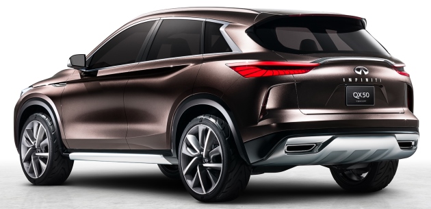 2016 yılında Beijing (Pekin) Otomobil Fuarı’nda ilk olarak gösterilen ve Avrupa prömiyeri ise Paris Otomobil Fuarı’nda yapılan INFINITI QX Sport Inspiration’ın devamı niteliğindeki QX50 Concept, markanın yeni “Güçlü Zarafet” tasarım anlayışını yansıtıyor. INFINITI’nin karakteristik radyatör ızgarası görkemli bir ifade sağlarken yüksek motor kaputunun dinamik yapısı tüm aracı çevreleyerek arkaya doğru uzanıyor. INFINITI’nin imzası niteliğindeki “yeni ay kesimli” C sütunları ve “insan bakışlı” farları QX50 Concept’te de varlığını sürdürüyor.